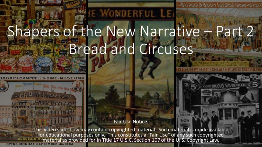 The second part of this series was about the role played by such things as penny candy; dime museums; circuses; nickelodeons & the early movie industry; and daredevils…