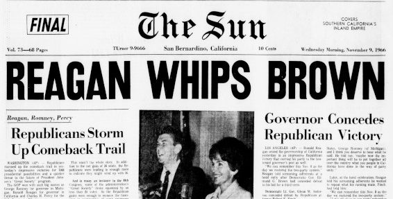 In late 1965, Ronald Reagan announced his campaign to run for Governor of California in 1966. and defeated two-term Democratic Governor Pat Brown.