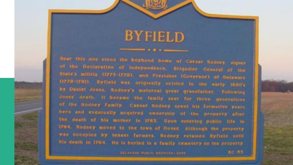 Byfield, the 849-acre farm that Caesar Rodney was born on, earned sufficient income from the sale of wheat and barley to the Philadelphia and West Indies markets to provide cash and available time that allowed the family members to participate in the social and political life of Kent County.