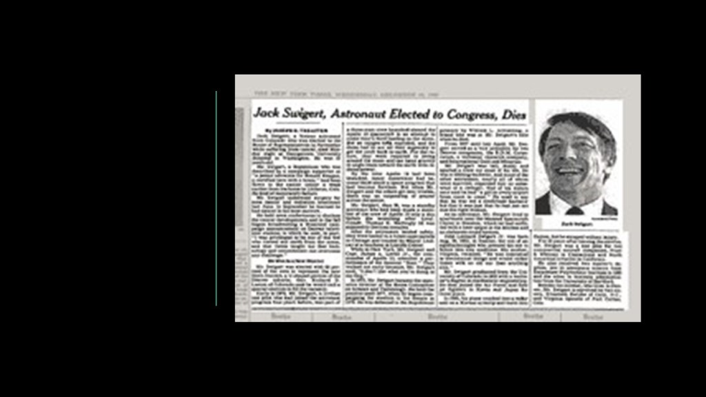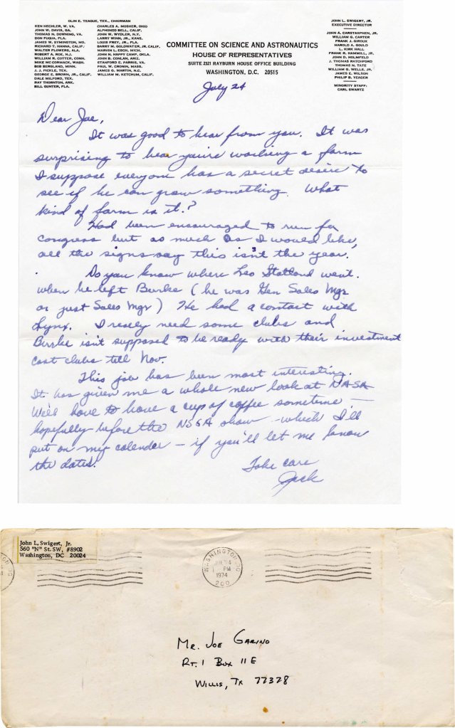 Shortly thereafter, Jack Swigert went to Washington, DC, to become the Executive Director of the Committee on Science and Astronautics for the U. S. House of Representatives.