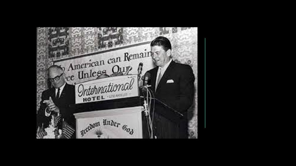 He emerged as a leading conservative spokesman in the Goldwater Presidential campaign of 1964, at which time he gained national attention in his speeches on behalf of Barry Goldwater.