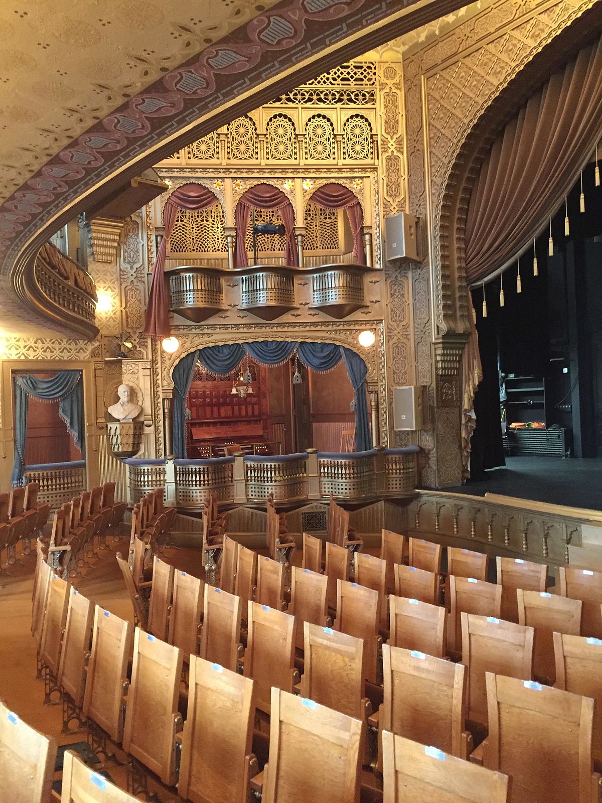 This is the inside of the Mabel Tainter Memorial Theater in Menomonie, Wisconsin, said to have been built in 1889 by Andrew and Bertha Tainter as a memorial for their daughter Mabel who passed away from a ruptured appendix in 1886.