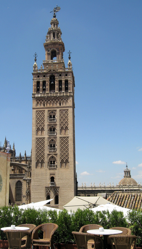 This is the Giralda Bell Tower, said to have been completed in 1198 in Seville, one of the capitals of Moorish Spain.