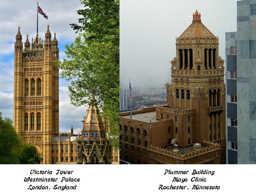 The Victoria Tower in the Westminster Palace complex in London, which houses Parliament, is on the left, the building of which is said to have been completed in 1860, and on the right is the Plummer Building of the Mayo Clinic in Rochester, Minnesota, said to have opened in 1928.