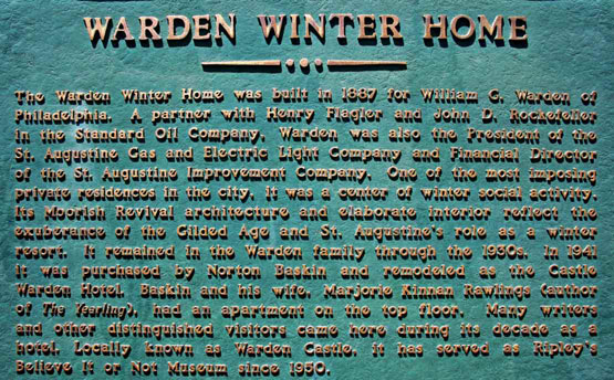 …as a winter home for William H. Warden of Philadelphia, Pennsylvania, a partner with Henry Flagler and John D. Rockefeller in the Standard Oil Company; President of the St. Augustine Gas and Electric Light Company; and the Finanical Director of the St. Augustine Improvement Company.