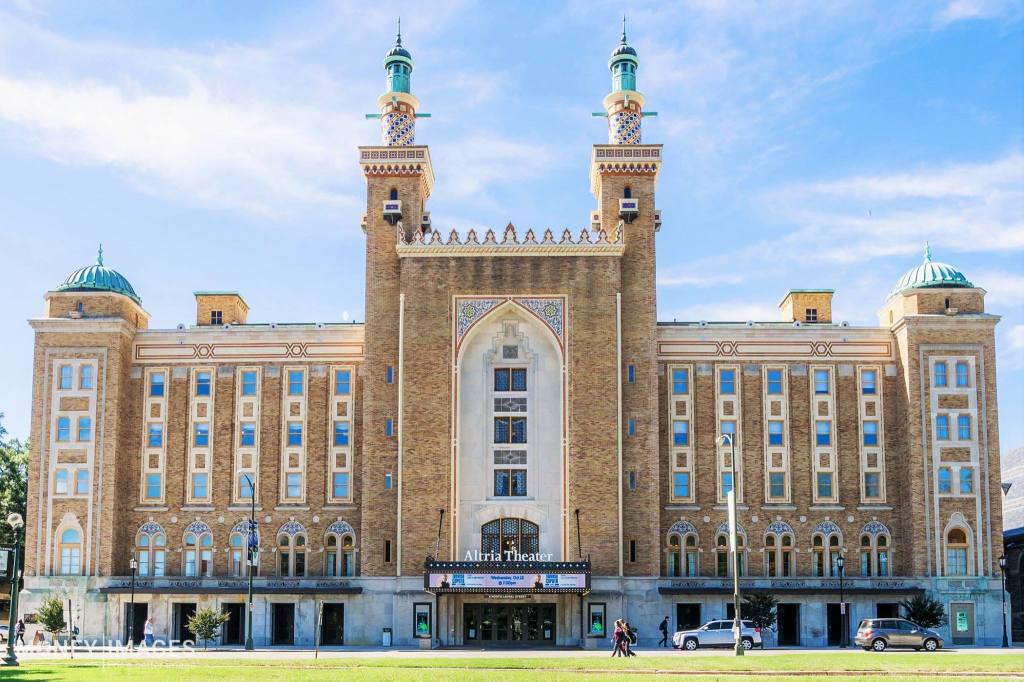 This is photo of the historical Alhambra Theater in El Paso, with its ornate and intricately-designed facade…