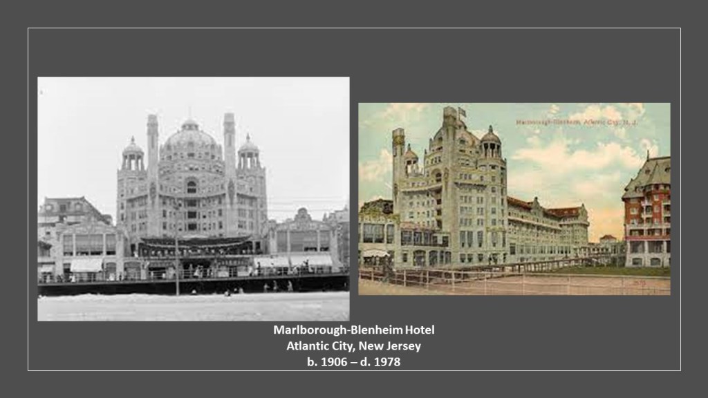 Here are two Moorish-looking old hotels that used to be in Atlantic City – the Marlborough-Blenheim Hotel, which was said to have been built between 1902 and 1906, and demolished in October of 1978…