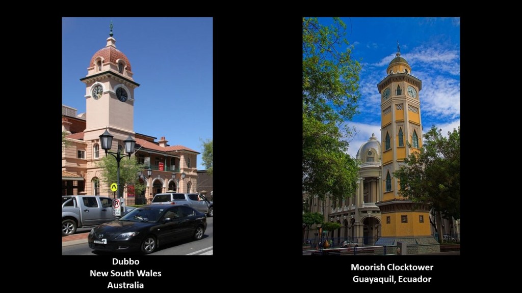 This is the Old Dubbo Post Office on the left, said to have been built in 1887, compared with the Moorish Clocktower, in Guayaquil, Ecuador, said to have been built starting in 1930…