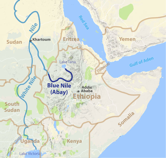 The source of the Blue Nile is Lake Tana, a sacred lake in Ethiopia, and it joins the White Nile to become the Nile at Khartoum, the capital of Sudan.