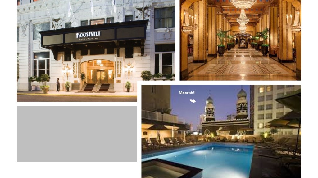 …and the Hotel Grunewald, a 504-room hotel, said to have been built by German immigrant Louis Grunewald in 1893 and now known as The Roosevelt New Orleans of the Waldorf-Astoria hotel chain.