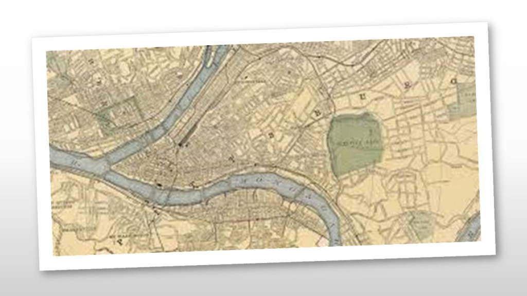 This is a view of the “Forks of the Ohio” at present-day Pittsburgh…