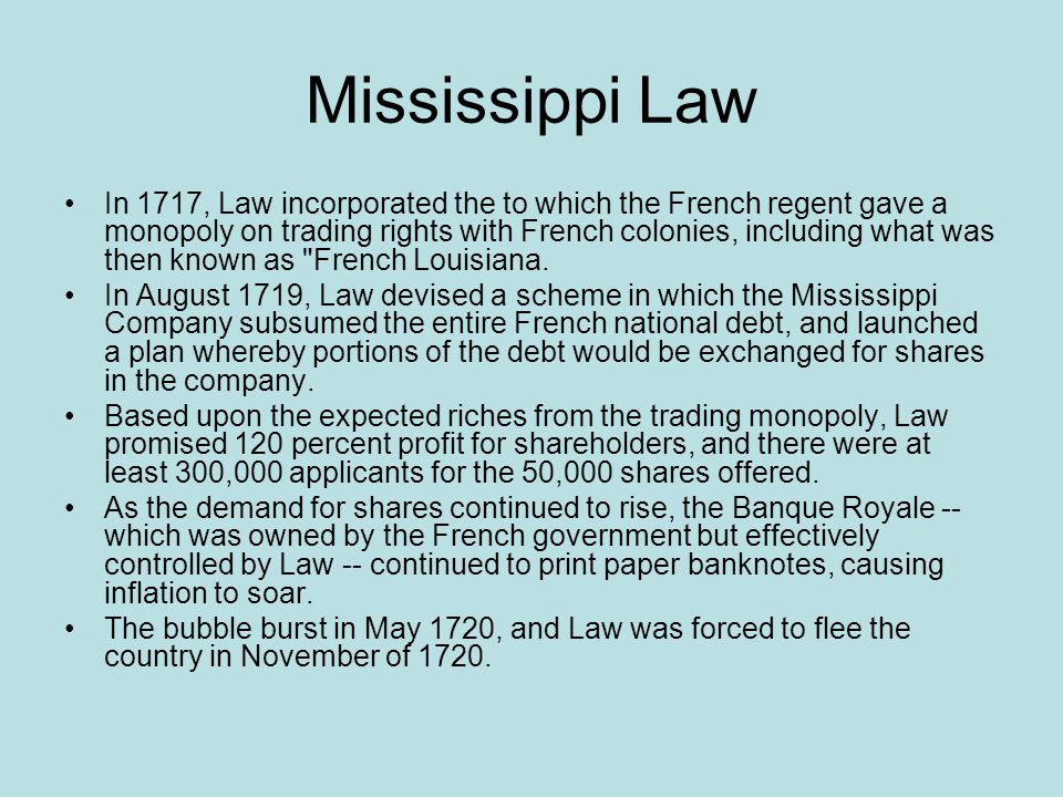 The Mississippi Company acquired important monopolies in the tobacco trade, exclusive trading rights in Louisiana, the Mississippi River Valley, China, East India, and South America.