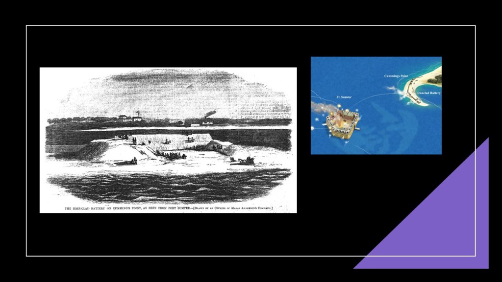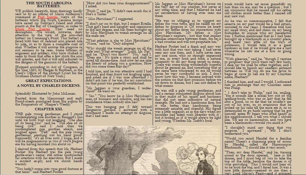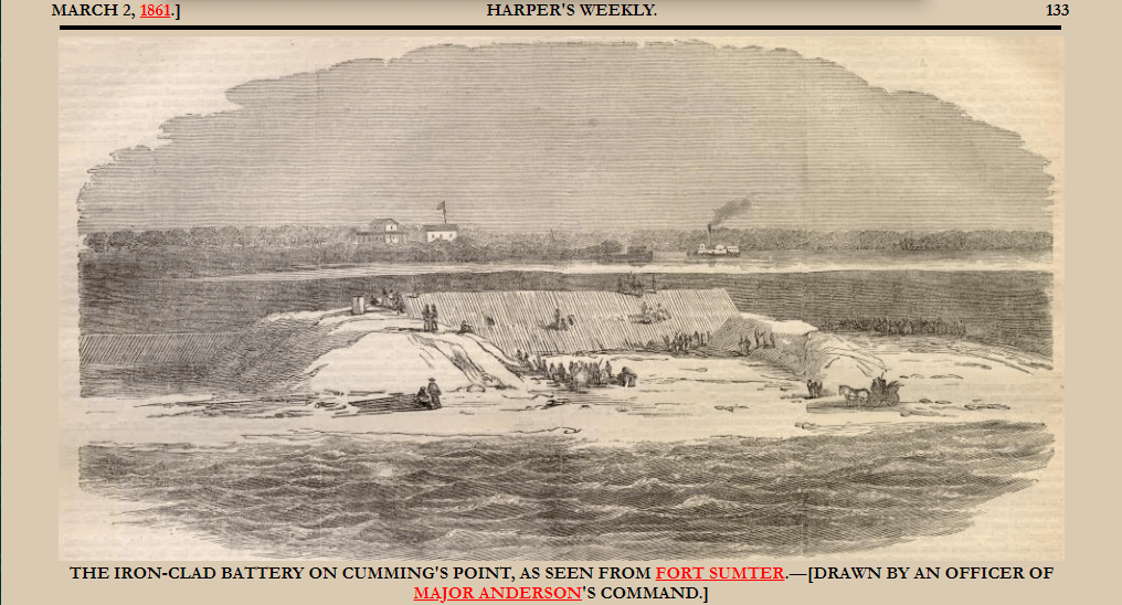 A story about the ironclad battery at Cummings Point appeared in Harper’s Weekly Magazine, on March 2nd of 1861, along with the 21st Chapter of Charles Dickens novel “Great Expectations,” which was first released in a serial format in his weekly periodical “All the Year Round,” starting December 1st of 1860, and apparently it appeared in other magazines as well.