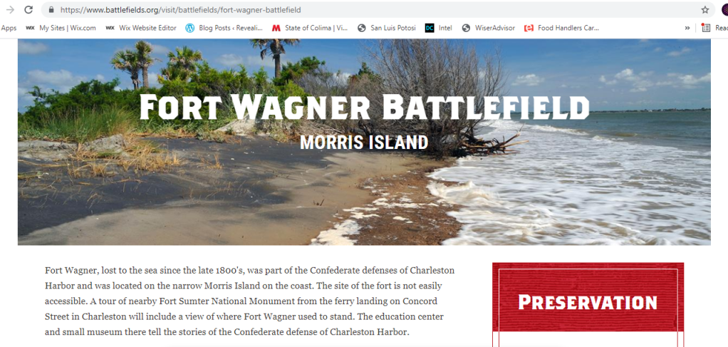 When looking for information on the Cummings Point battery, I found the historical Fort Wagner on Morris Island, which would have been located between the “Star of the West” battery to the south and the Cummings Point battery to the north of it.