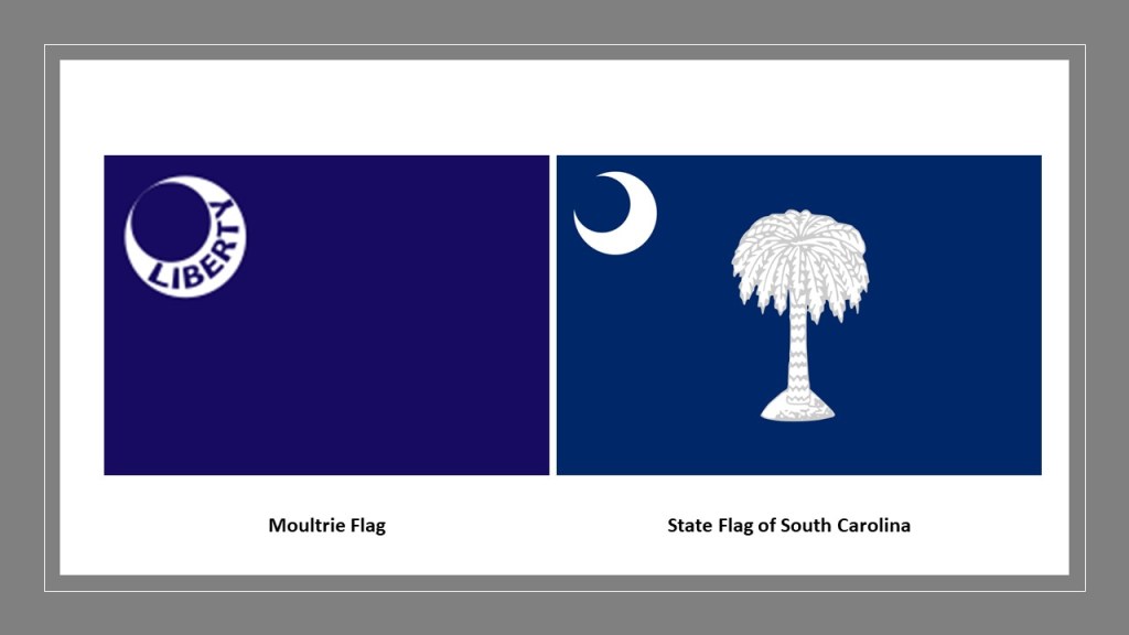 What is called the Moultrie flag on the left was flown during the defense of Fort Sullivan in 1776.