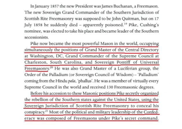 One is that when he became the most powerful Mason in the World when he became the Sovereign Grand Commander of the Southern Jurisdiction; he secretly organized the rebellion in the Southern States using this jurisdiction as a cover; and that most of the leadership of the Confederacy, both political and military, were Freemasons under Pike’s secret command.