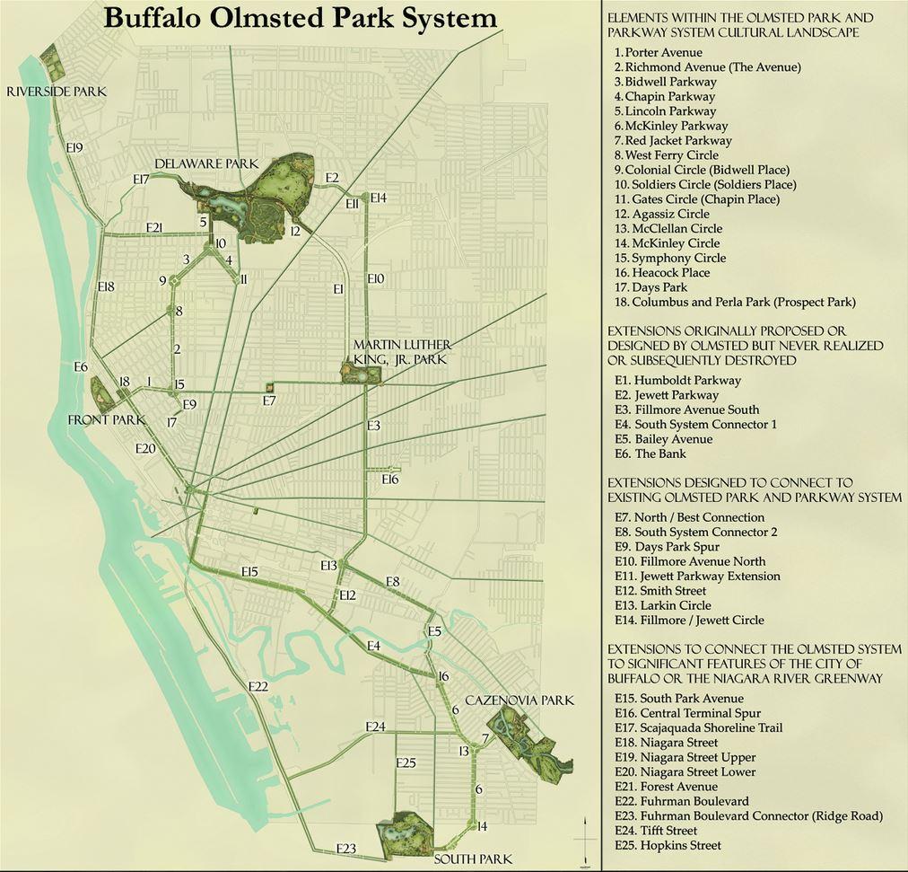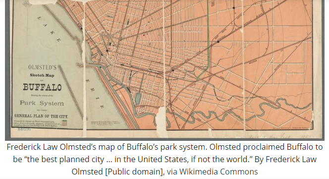 According to the notation on the bottom of this image of his map of the Buffalo Park System, Olmsted proclaimed that “Buffalo was the best planned city in the United States…if not the world.”
