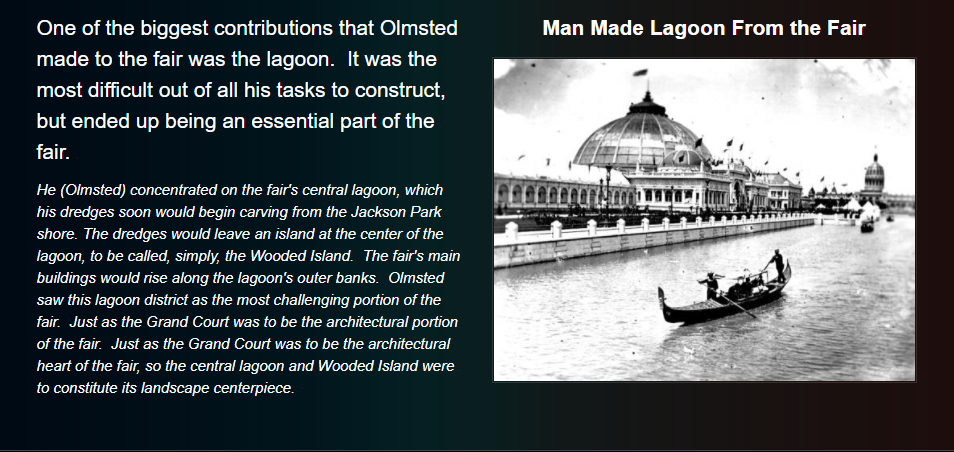 This area was described as a sandy area along Chicago’s lakeshore that looked like a deserted marsh before construction began, but Olmsted saw, we are told, the area’s potential, and that his design included lagoons and what became known as Wood Island since they had not been developed yet.