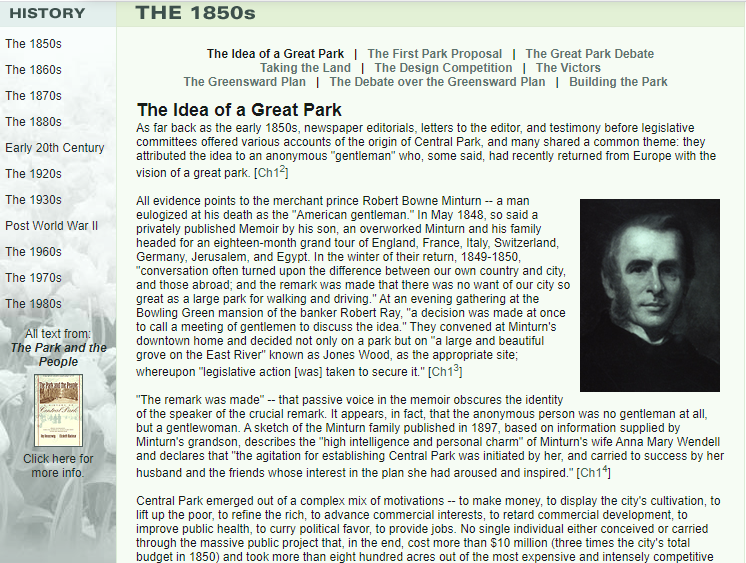 Backing up in time just a tad regarding Central Park, the land for it was said to have been donated by Robert B. Minturn, after he and his family’s return from an 18-month grand-tour of Europe between 1848 and 1850.