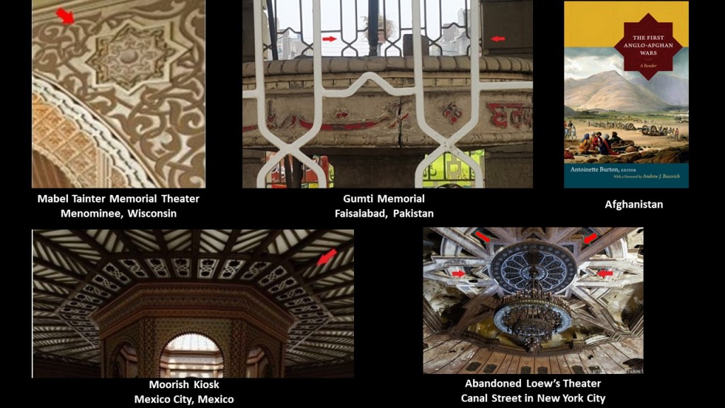 On the top left, a detail at the Mabel Tainter Memorial Theater in Menominee, Wisconsin; at the Gumti Memorial in Faisalabad, Pakistan in the top middle; and on a book cover about the First Anglo-Afghan War on the top right; and on the bottom left, at the Moorish Kiosk in Mexico City; and on the bottom right, above the chandelier at an abandoned Loew’s Theater on Canal Street in New York City.