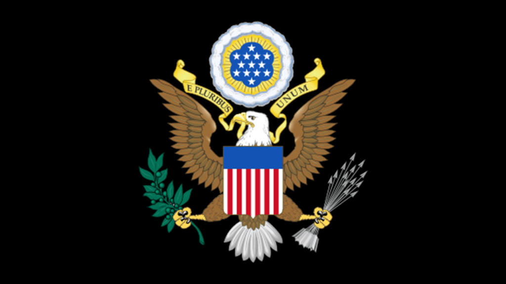 On one side is the national Coat-of-Arms of the United States, and among other symbolism, prominently depicts an eagle, and the motto “E Pluribus Unum,” or “Out of Many, One.”