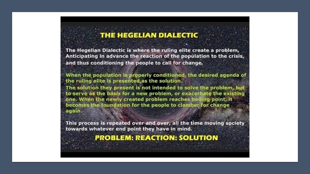 …through the systematic application of the Hegelian Dialectic of Problem – Reaction – Solution.