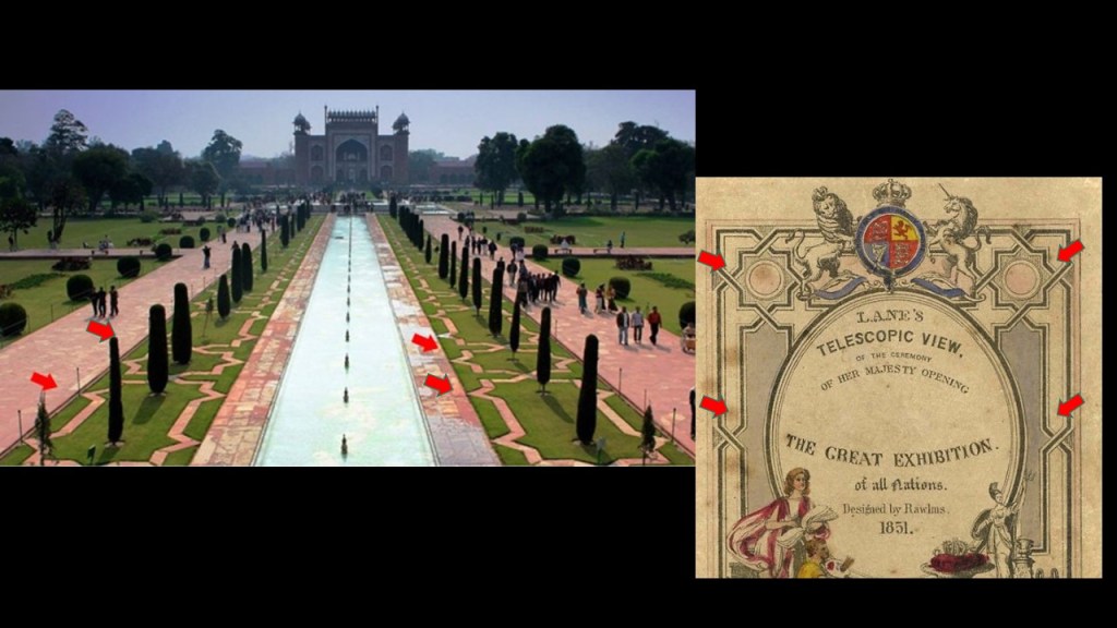 The Great Exhibition of the Works of All Nations, held in the Crystal Palace in London in 1851 was also known as “The Great Shalimar” a reference to the Mughal Garden complex in Lahore where you see the same eight-pointed star and similar design-patterns in the Mughal Gardens on the left and on the Great Exhibition brochure on the right.
