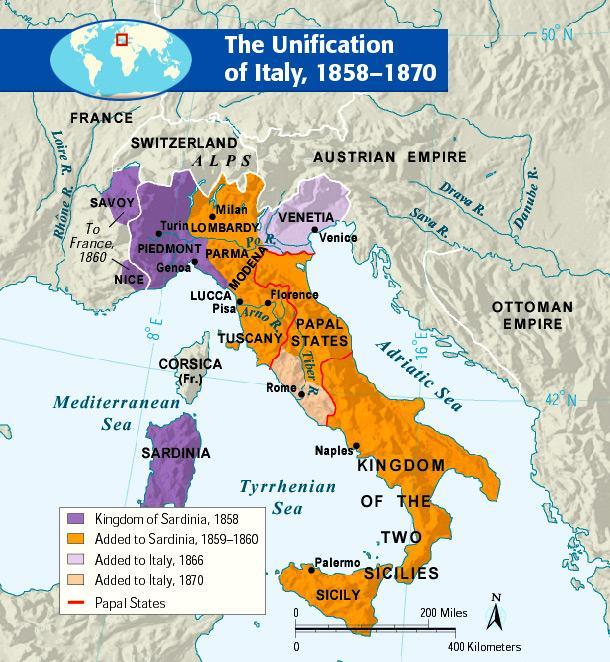 The Unification process of Italy, known as the Risorgimento, started with the Revolutions of 1848 in Italy and was completed in 1870 – 1871.