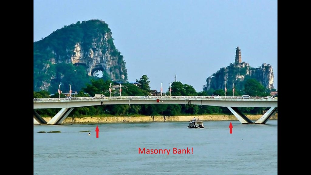 Here is a view of Pagoda Hill next to Chuanshan Hill, with the Li River, with its masonry bank, in the foreground…