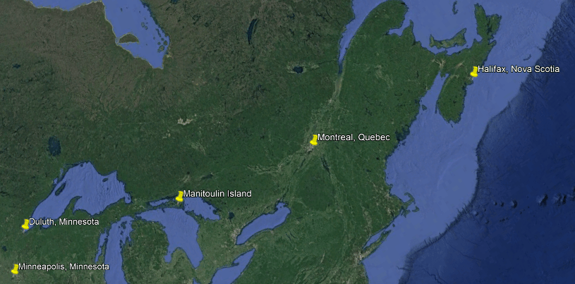 On a quick search, these four places appear to line-up with each other – Minneapolis, Minnesota; Manitoulin Island, Ontario; Montreal, Quebec; and Halifax, Nova Scotia.