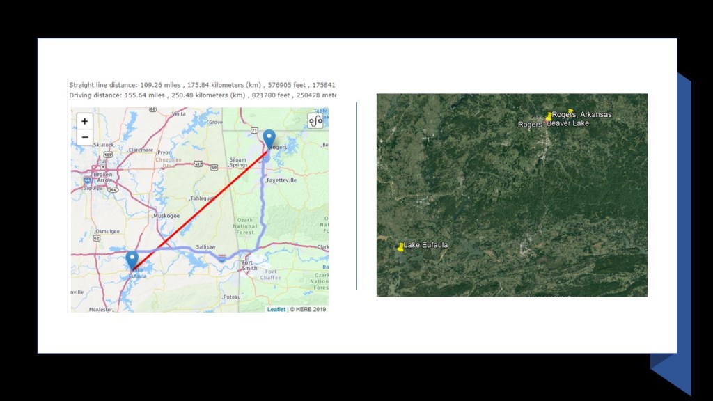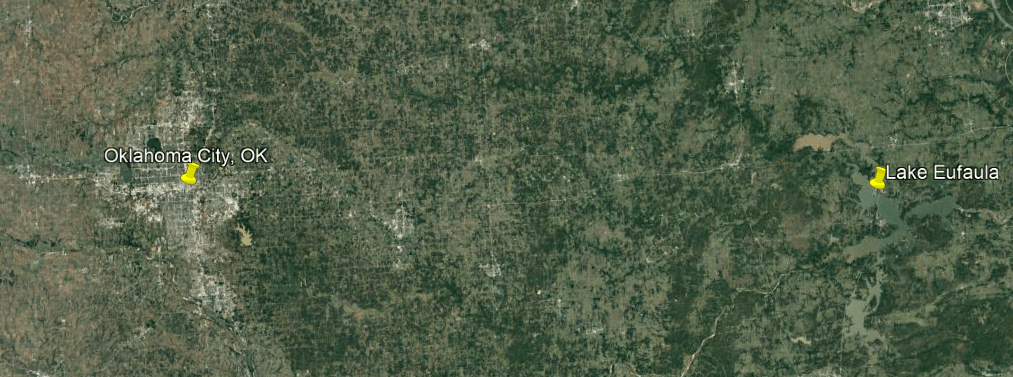 …and Rogers, Arkansas, is a straight-line distance of only 109-miles, or 176-kilometers, from the city of Eufaula at Lake Eufaula.