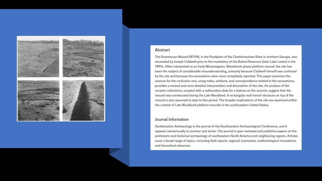 Summerour was a mound site that was excavated between 1951 and 1954 by archeologist Joseph Caldwell, before it was flooded by the waters of the Buford Dam.