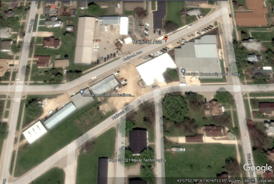 I looked for rail-related infrastructure near Decorah, which now only has Railroad Street and Railroad Avenue, with the Mediacom Communications facility sandwiched between the two…