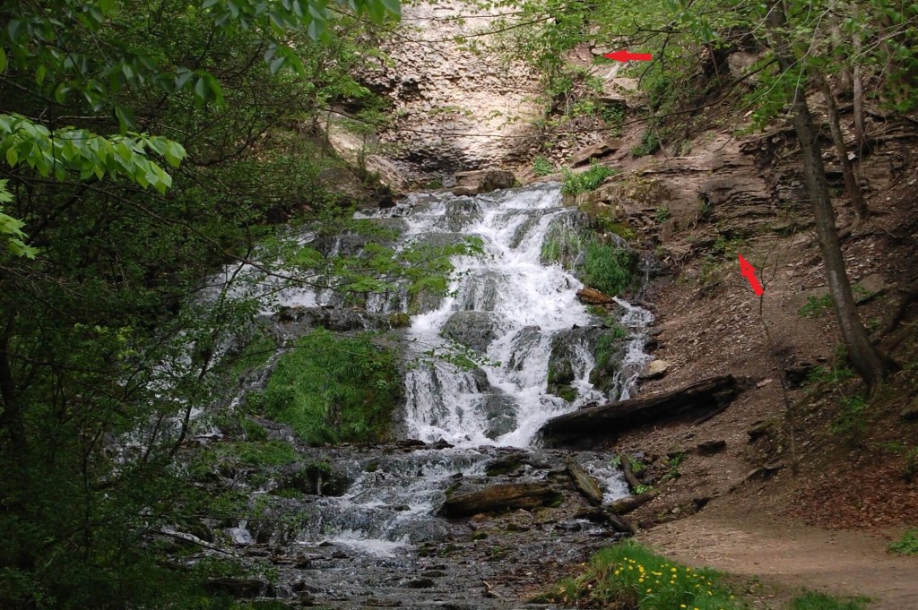 For all of the following waterfalls, I am going to point out with red arrows what looks like an old wall, or old masonry, to me.