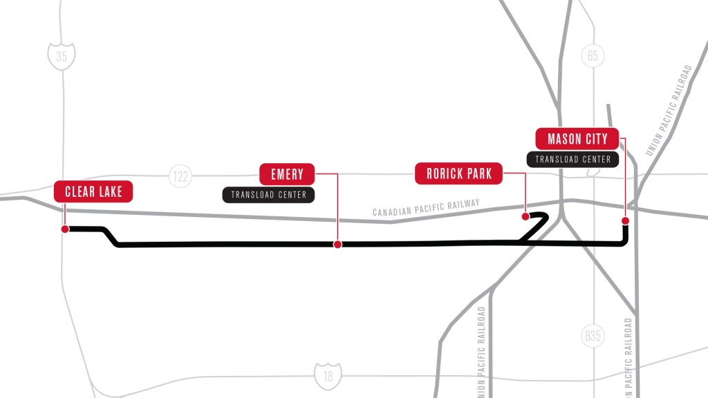 The “Iowa Traction Railroad Company,” headquartered in Emery, west of Mason City, operates a short-line rail-line, that is around 10-miles, or 17-kilometers, -long freight railroad between Mason City and Clear Lake, Iowa, that interchanges in Mason City with the Canadian Pacific Railway and Union Pacific Railway.