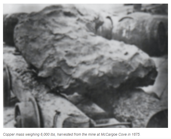 …as well as in the mid-to-late 1800s, like this 6,000 lb, or 2,722-kilogram, chunk of copper that was mined from the McCargoe Cove mine in 1875.