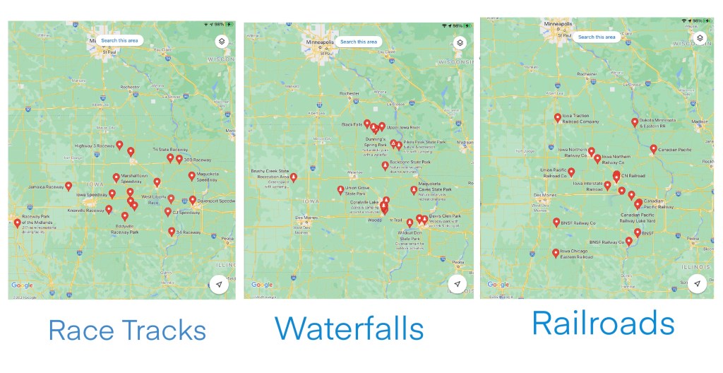JG sent me this overlay that she put together of the racetracks, waterfalls, and railroads in Iowa…