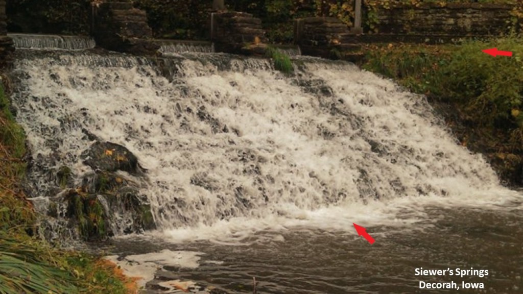 …as well as the falls at Siewer’s Springs near Decorah, described as “technically a spillway, but a gorgeous staircase formation….”