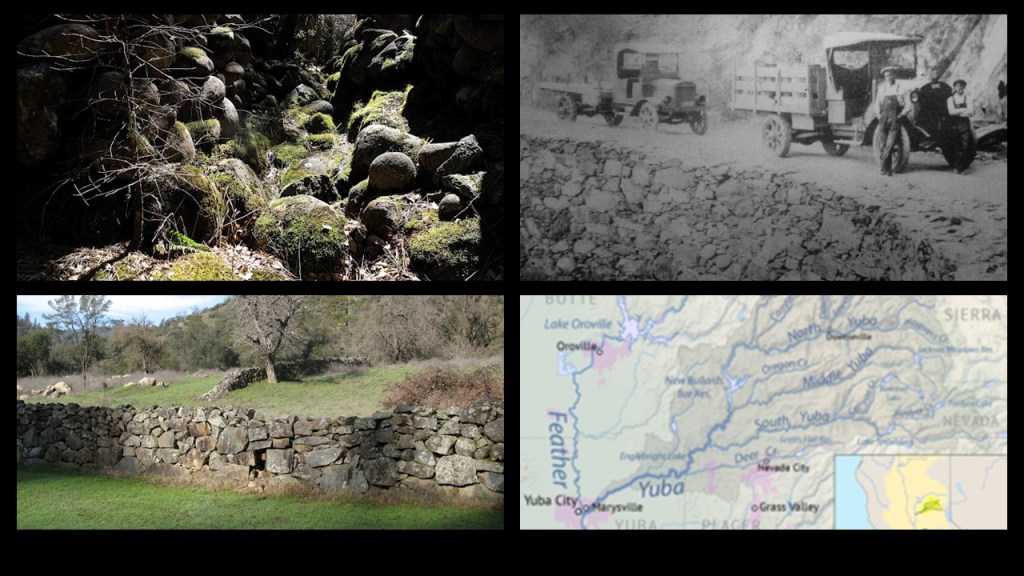I found these examples of stone walls in California’s Yuba River Country, which extends from the High Country of Sierra and Nevada County to the Feather River between Maryville and Yuba City.