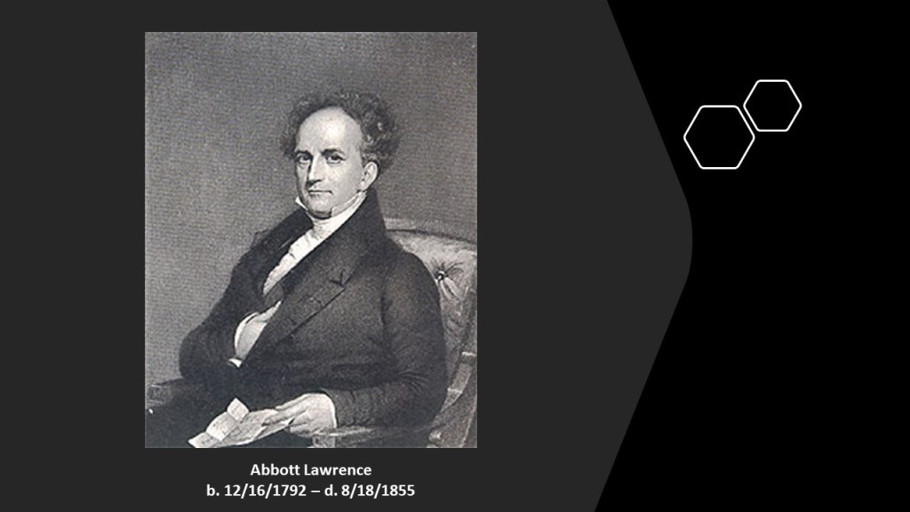 Abbott Lawrence was involved in things like establishing the cotton textile mill industry in New England; promoting the railroad for economic development; was one of the partners in A. & A. Lawrence Company, which went on to become the greatest wholesale mercantile house in the United States back in the early days; was a Representative for the Massachusetts 1st District in the U. S. Congress between 1835 and 1837; and he served also as an Ambassador to the United Kingdom between 1849 and 1852 under Queen Victoria.