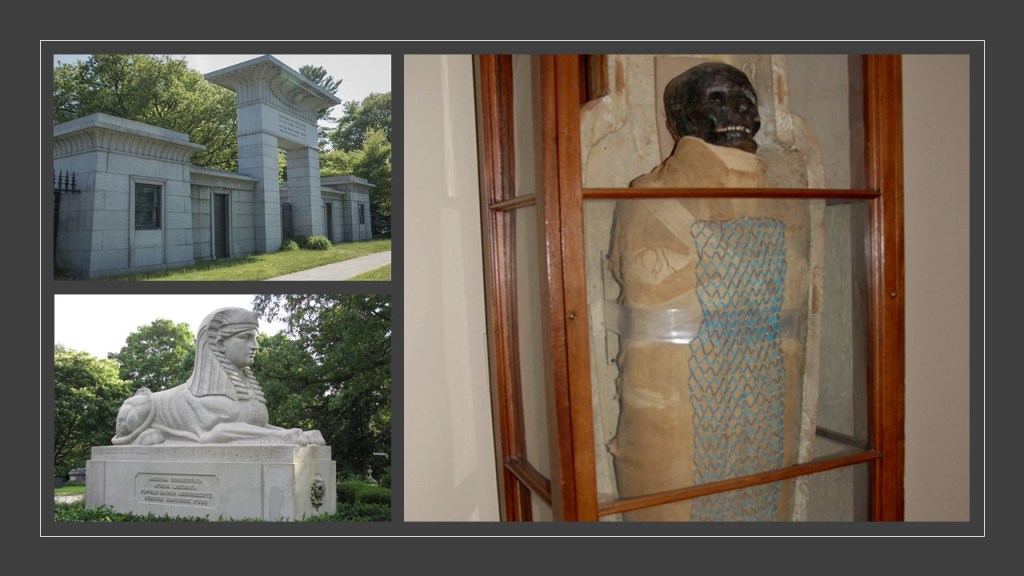So far in Boston, we have an Egyptian Revival-style cemetery gate; Sphinx; and mummy.