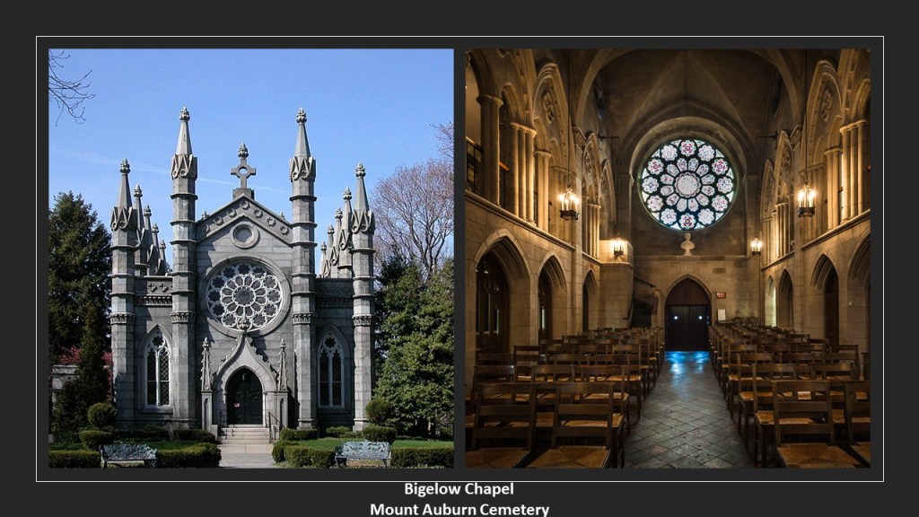 The Bigelow Chapel on the Mount Auburn grounds was said to have been designed in the Gothic Revival style by Dr. Jacob Bigelow, and built in the 1840s for funeral services and public programs.