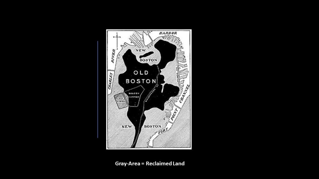 Also, interesting to note that land reclamation started here in 1820, in order to create land where there was originally water around the original peninsula, with the gray on this map of Boston showing where land was reclaimed.