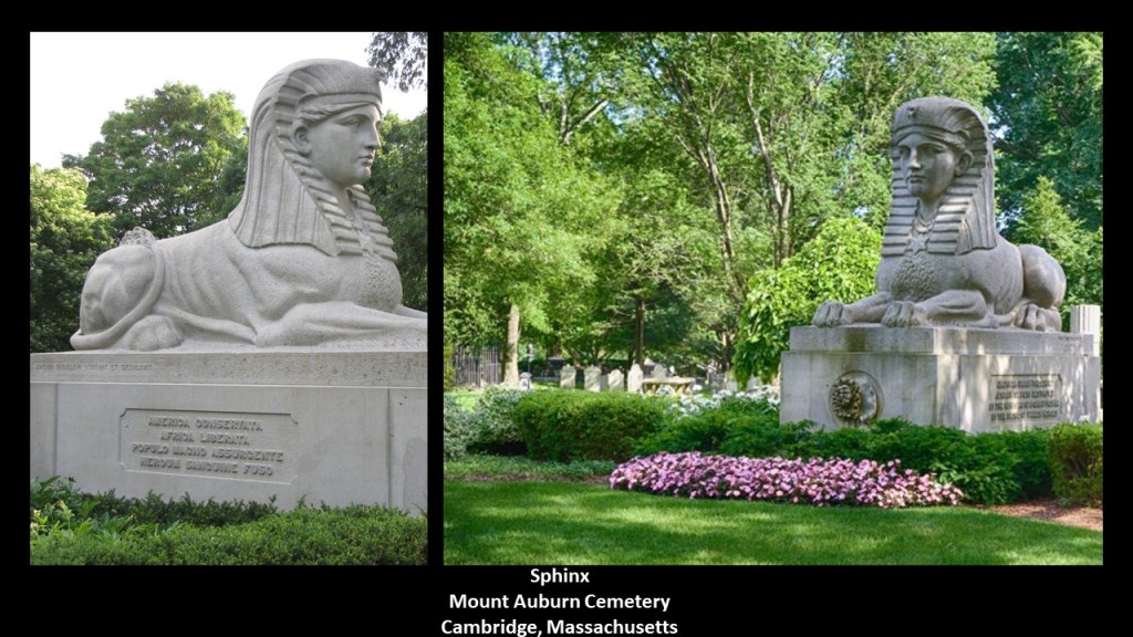Interesting to note that the “Sphinx” sculpture on the Mount Auburn Cemetery grounds appears to be situated directly in front of, and facing, the Bigelow Chapel.
