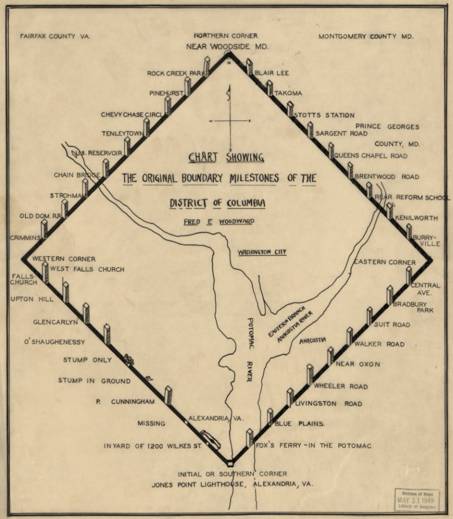 In order to accomplish this surveying task, we are told that land belonging originally to the states of Maryland and Virginia was divided up, and a diamond spanning 10-miles in each direction was marked at each mile by a similar stone marker