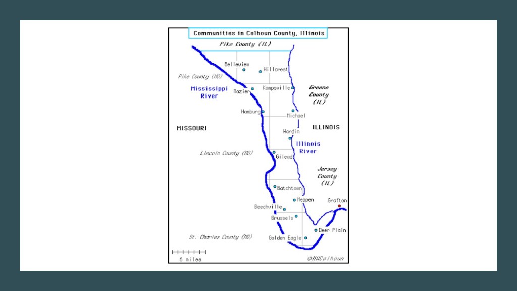 Calhoun County is a long, skinny county that runs along the Mississippi River border of Illinois and Missouri, and named for John Calhoun, the 7th Vice-President of the United States between 1825 and 1832, during the administrations of Presidents John Quincy Adams and Andrew Jackson, and the Calhoun family that was prominent in the area at the time.