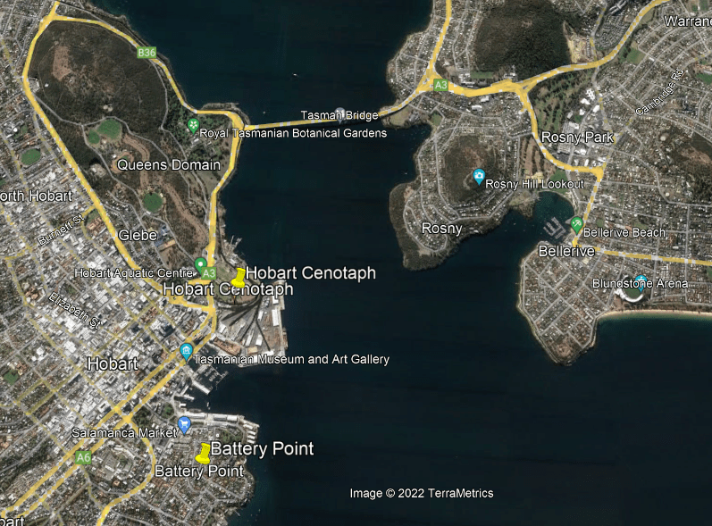 Here is a Google Earth Screenshot showing the location of the Hobart Cenotaph and Queen’s Domain, in relationship to other nearby places.