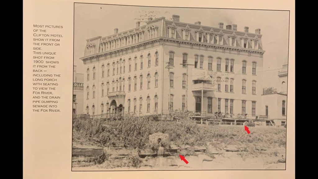 Interesting to note what it says about the long porch with seating to view the Fox River…and the drain-pipe dumping sewage into the Fox River.
