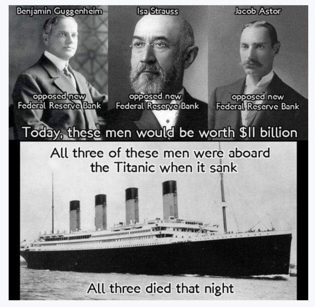 Also, prominent people opposed to the creation of the Federal Reserve were on board, including John Jacob Astor IV, Benjamin Guggenheim, and Isidor Strauss.