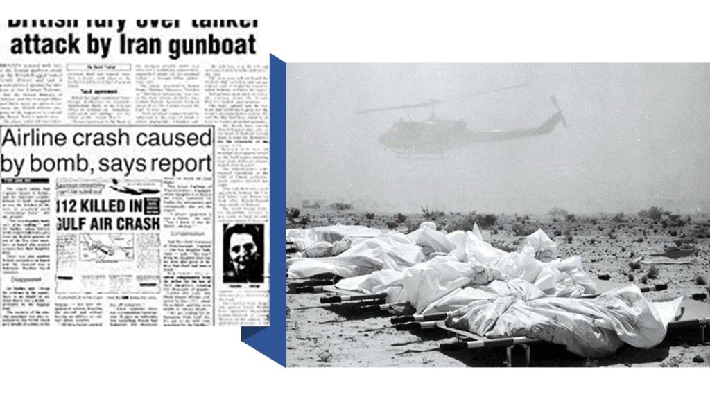 Gulf Air flight 771 crashed in the desert in United Arab Emirates on September 23rd after a bomb exploded in the baggage compartment, killing 112.